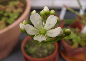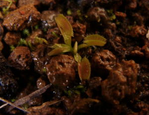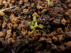 種がとれたので採り播きしたところ小さな芽がいくつも出てきました。 小さいながらもちゃんと捕虫葉をつけています。 発芽率は結構良いみたいです。 心配していた親株も調子を崩すことなく順調に生育しています。 (2003 9/21) |