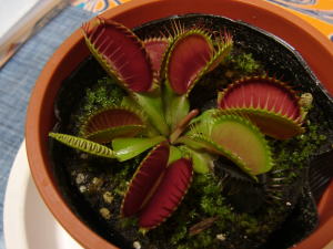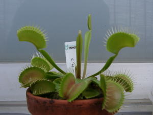 ビオパルコ三明さんから購入。 これを知らない人はいないと言うほどの食虫植物の代名詞的な存在。 1属1種の植物ですが、最近は様々な形態の品種があるようです。 個人的には、最近流行の葉が立ち上がるエレクタタイプより昔ながらのロゼットタイプの方がハエトリグサらしくて好きです。 と言う事で、ロゼットタイプのものを送ってもらいました。 (2002 6/30) |