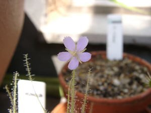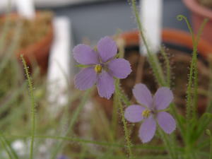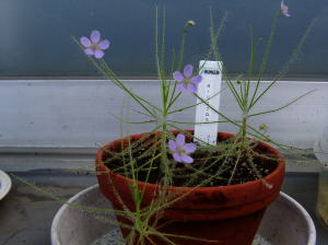 ビオパルコ三明さんから購入。 細長い捕虫葉を展開しながら伸び上がる非常に繊細な感じの種類です。 夏から秋にかけて綺麗な花を咲かせてくれると言う事で、楽しみにしています。 この植物は1年草です。 (2002 6/30) |