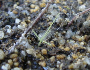 発芽し始めました。 上の去年発芽した物は冬の間に枯れてしまいましたが、新しく発芽が確認できました。現在4本ほど芽が出てきています。 特にジベレリン処理などは必要ないようです。 今年はビブリス畑ができるかな? (2003 4/27) |