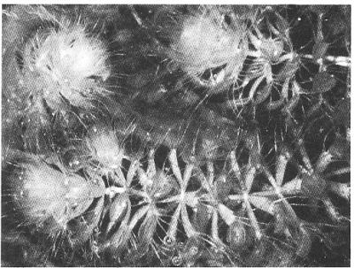 | ムジナモは、ムジナモ科に属し、一属一種の珍草である。根がなく、沼や水田などの水たまりに浮遊して生育し、冬は茎の先が球状にかたまり越年する。茎は長さが六〜二五センチぐらいにものび、ときには一〜四本ほどの枝をだしている。茎の節節には、普通六〜八個の葉を輪生し、葉柄はくさび形で、その先端は長い数本の刺毛となっている。葉身はハマグリを開いたような形で、水中で開き、虫の来るのを待ち、虫を捕らえると葉身を閉じて消化してしまう。花は径一センチに満たない淡緑色で、夏水面上に出て開く。がく、花びらはそれぞれ五個、おしべは五本、花柱も五個となっている。 | |||||