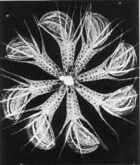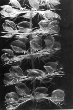 ![]() 水中のムジナモ。 葉がハマグリの形のように開いている。 |