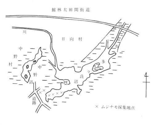 | 明治三八年九月下旬(小島茂三郎、高澤誠三の両生徒が、多々良沼からムジナモを採集して高野氏に知らせた後)に、松村氏は、太田中学に通学していた小島儀三郎氏(小島茂三郎の兄)から、弟の茂三郎が、九月下旬に多々良沼の一角にてムジナモを見出し、高野氏に示したところムジナモであることが分かり、高野氏は、早速同地を訪れ、数多くのムジナモを採集して大学等にも贈ったことを聞き、一〇月一日小雨の中を中野村に行き、小島兄弟の操縦で小舟を多々良沼に浮かべ、ムジナモを探し求めた。舟が沼のへりにさしかかると、茂三郎氏は、直ちにその一株を取って松村氏に示した。(茂三郎氏は、既に自ら採集して高野氏に示した時、ムジナモであることが分かっていたので、この松村氏の案内の時は、多々良沼のどこにムジナモが産しているのかははっきりしていた。)今までに見たことのなかった松村氏の眼には、水上に浮かぶムジナモの様子が、タヌキモ、クロモ、キクモ等と似ていて、ちょっと見分けもつかなかったが、(松村氏は少々近眼)後舟に棹してムジナモの数多く浮遊している中を通過するに従って、ようやく見慣れ、特にムジナモは水上に浮漂していること、その葉の密生していること、その色の鮮緑なることとは舟の快走している場合でも、容易に他の植物と見分けられるようになった。松村氏は、ムジナモは産地が少ない上貴重な植物なので他の植物と交換用にと多数採集した。ただおしいことに時期が遅いため一つも花果を見ることはできなかった。 これまでに度々多々良沼に採集を試みた高野氏が、ムジナモを発見できなかった理由を松村氏は次のように述べている。 「多々良沼のムジナモを産する場所が、全く西方に外出せる一角にして、水量少なく、アシやマコモの叢生している所なので、この方面まで探されなかったのではなかろうか。」 この時案内した小島茂三郎氏の言によれば、「ムジナモがあるのはこの部分のみであって、この区域を中野沼といい、日向沼にはムジナモは見かけない(茂三郎氏の言う中野沼とは、多々良沼の西方が中野村字鶉新田に面する区域を俗に呼んでいたもので、日向村に面した広い区域は日向沼と呼んでいた)。」と、ただし別に独立した中野沼があって、ここにもムジナモを産すると聞いているが、雨天にして道悪く行かなかったということである。 松村氏は、小島兄弟に案内されて、多々良沼でムジナモを採集したこの時の記事を、明治三九年一月二五日発行の博物学雑誌第六六号P21〜23に述べているが、この記事の中にムジナモを採集した地点を多々良沼の略図の上に示している。 |