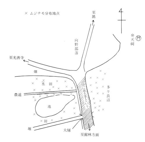 | この図に示されたムジナモ分布地点は、先に博物学雑誌第六九号に松村氏が、小島兄弟の案内で調査採集された際発表されたムジナモ分布地点と殆んど同じであり、続いて同誌第六九号に高野氏の発表された多々良沼のムジナモ分布地点と全く一致するものである。 以上のことから明治三八年における多々良沼のムジナモ分布は、俗称赤土手(堤防)から、弁天付近までの中野村に面した区域と赤土手の反対側の水田に多産していたことが明らかである。 |