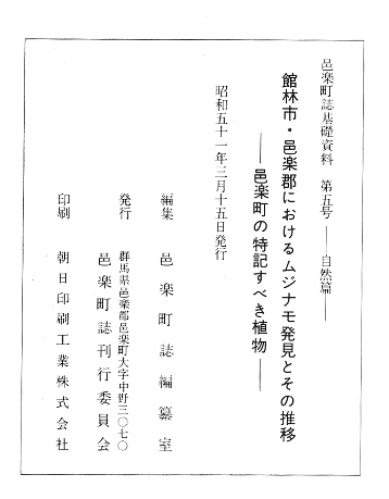 | タタラカンガレイは、昭和六年に関本平八氏(栃木県在住・植物研究家)によって、多々良沼で発見採集された植物である。その後の筆者の調査により、昭和三七年一〇月二〇日には、多々良沼の南東から南にかけての湿地に四〜五株、昭和三八年夏中野沼埋立地の湿地に、昭和三九年九月二七日には、埼玉県三田ヶ谷の湿地に昭和四九年八月には、多々良沼の北の干拓地内の湿地に多産していることが判明した。なお邑楽町誌作成のため町内の植物調査中、昭和五〇年七月二六日に旧中野沼埋立地内に多産していることを確認した。郡内では、板倉町に産していることを松沢篤郎氏が報じている。しかし、現在までの筆者の調査では、旧中野沼埋立地が多産していることと生育もよく、自然環境も良好であることから、今後郷土に残せる唯一の場所であると考える。全国的にも産地が限られている貴重なタタラカンガレイをいつまでも邑楽町に残したいものである。 終わりにこれまでに種々ご指導賜った前館林市立図書館長川島維知氏、ならびにムジナモに関する古文書の解読についてご指導を賜った館林市文化財調査委員贄田太二郎先生に厚くお礼申し上げます。 また貴重なるムジナモの写真は、この道の権威者である清水清氏(東京在住)により、筆者に恵送されたものを使用させていただきました。ここに厚くお礼申し上げます。 |