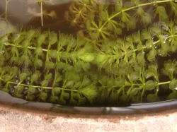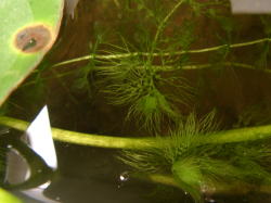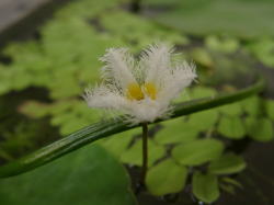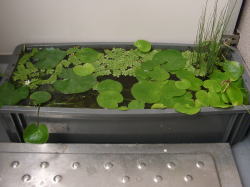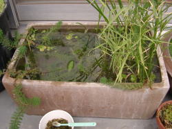 ●水鉢4号 トチカガミが勢力を拡大しています。 ガガブタが花を咲かせ始めました。わずか1p足らずの花ですが、かわいいです。 この水鉢の置き場は直射日光が当たるのはほんの1〜2時間です。そのせいでしょうか。ここのムジナモは節間が長く、芽も細い感じです。生育が悪いと言うか、徒長気味なんですね。 相変わらずわずかですがアオミドロが発生しています。毎日の潅水で押し流している状態です。タヌキモやムジナモの成長に影響はないようです。 |