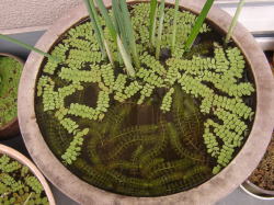 ●水鉢1号 アオミドロの発生も見られず、ムジナモも順調に育っています。 ここのムジナモは本当に良い状態で、節間も短く、コロコロと太った感じです。 サンショウモはどんどん増えるので、4〜5日に1回は1/3ほど取り去っています。それでもすぐに増えちゃうんですが・・・。 |