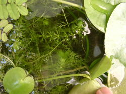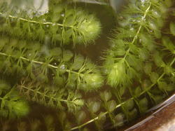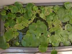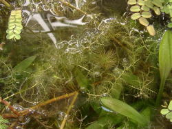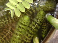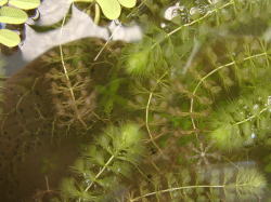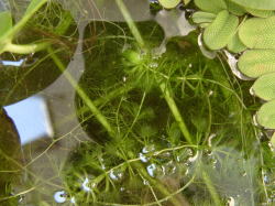 ●水鉢4号 トチカガミとガガブタの葉が水面を覆っています。 葉の陰になりながらもムジナモとイヌタヌキモはよく成長しています。 前回ムジナモがちょっと貧弱、と書きましたが、現在では徒長気味ではあるものの、大きな捕虫葉をつけており、まだ分岐もしています。 アオミドロは相変わらず少量発生しており、毎日こまめに取り除いていますが、ムジナモ、タヌキモの生育には影響は出ていません。 |