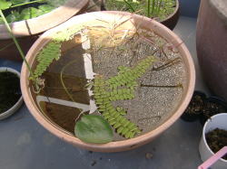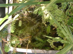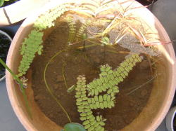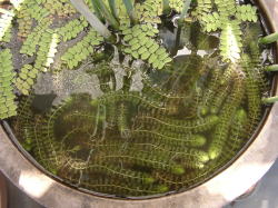 ●水鉢3号 ミョウバンでアオミドロを駆除した水鉢3号ですが、アオミドロはほんの少し残っていますが、ほぼ駆除できました。ただムジナモは調子を崩してしまったので現在取り出しています。 入っているのはフサタヌキモと、ノタヌキモと思われる外国産のタヌキモですが、外国産タヌキモはよく繁茂しています。ただ今年はまだ花を咲かせてくれません。 |