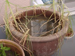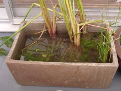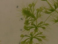 ●ムジナモの現状 光量不足のためもあり、水鉢1号、睡蓮鉢に入れていたムジナモは消滅してしまいました。 水鉢3号に入れていたムジナモの内、かろうじて2本+αが生き延びています。 水鉢1号のコガマも光量不足のためかほとんど駄目になりつつあったので、思い切って今生えている分は全て刈り取ってしまいました。 水鉢3号のポンテデリアは元気はあるのですが、ハダニが大発生しており、こちらも地上部は全て刈り取ってしまいました。 ムジナモは水鉢3号の物のうち2本+αだけが生き延びました。1本は何とか捕虫葉をつけている状態、もう1本は捕虫葉は無い状態、もう1本はもう今にも駄目になりそうな物です。 この内捕虫葉の無い物を水鉢1号に移しました。 |