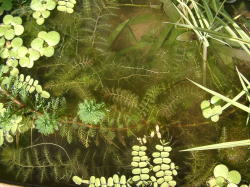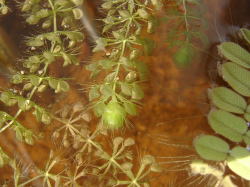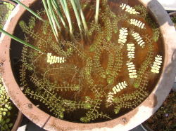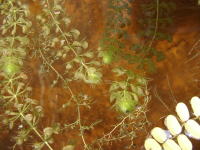 ●水鉢3号 アオミドロがひどくなってしまったので2日前からミョウバンを加えてアオミドロの除去を行いました。タヌキモ類はアオミドロをものともせずに成長するのですが、ムジナモはアオミドロが絡むとやはり成長が悪くなります。1号のムジナモに比べて今ひとつといった感じです。 |