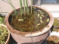 ●水鉢1号 依然として白濁が取れなかった水鉢1号。おそらく枯れたコガマの地下茎が腐ってきているのが原因だろうと言うことで、底床の土を入れ替えることにしました。 使用したのはADAのビオソイルと北海道産無調整ピートモス。今度はすっきりと透き通った水になりました。 ムジナモは全株好調に成長しています。 |