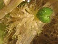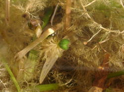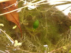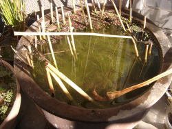 | 各水鉢ともムジナモは冬芽になって、本体は枯れています。丸型の水鉢は冬芽形成初期の時期にアオミドロが発生してしまい、冬芽の大きさが昨年より少し小さめになってしまいました。現在でもアオミドロが残っていますが、今のところ冬芽に影響はないようです。 その他の水鉢のムジナモは去年並みのしっかりした冬芽を形成しています。陶器製の角型水鉢は特に調子が良く、ほとんどの冬芽が上の写真のように2芽になっています。 この冬芽の段階で2芽になると言うのは去年も見られた現象で、環境が合っていてムジナモの調子が良い場合、冬芽を形成する時に分岐して2芽の冬芽が出来るようです。 |