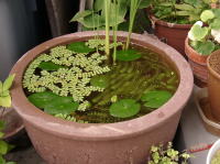 水鉢2号 8月中に立ち上げて置いた水鉢2号です。直径30センチほどのプラスチック製です。底土は赤玉土。紅姫アシとオモダカが植わっています。 危険回避のために、こちらに4株ほどムジナモを移してありますが、こちらも状態は良好で、よく成長しています。 ムジナモはちょっとしたことで調子を崩しやすいようなので、栽培容器を2つに分けた方が安心です。 |