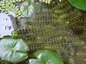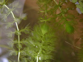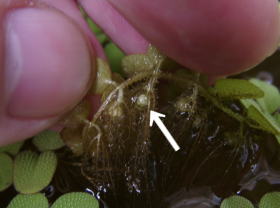 サンショウモの胞子嚢 サンショウモの繁殖スピードが落ちてきたと思ったら、いつの間にか水中に胞子嚢をつけ始めていました。 |