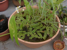 2002年9月15日の様子です。 ここのところ涼しさが続いて、それほど変化はありません。 ムジナモは相変わらず好調です。株数は35株になりました。 あれほど爆殖していたサンショウモも、成長スピードが落ちました。胞子嚢も付けはじめ、秋の装いになってきたようです。 |