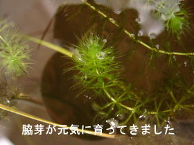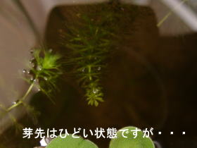 復活の兆し?!(ムジナモのその後) やせ細ってしまった芽先はそのままで、ダメっぽいのですが、ここの所、茎の中ほどから出てきた脇芽が順調に育ってきています。最初は細い芽だったのですが、最近捕虫葉も付いたしっかりした芽になってきました。古い茎にはまだアオミドロが絡んでいますが、新しい芽はそれに負けずにがんばっているようです。まさか脇芽から復活するとは考えていなかったので、とても嬉しいです。 |