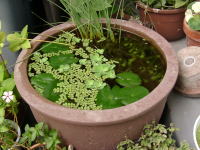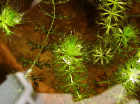 2002年8月17日の様子です。 ムジナモは完全に調子を取り戻しました。各芽は元気に成長しています。 株数は20株になりました。 水鉢の中のクロメダカはいつの間にか繁殖して、小さな稚魚が泳いでいます。 |