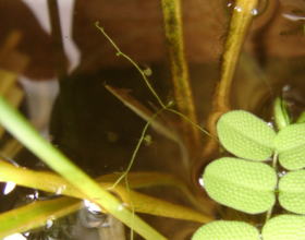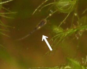 クロメダカの稚魚 水鉢の中に入れているクロメダカがいつの間にか繁殖しているようです。ここの所何匹かの稚魚が泳いでいます。特に隔離をしているわけではないので、何匹が生き残るかわかりませんが、それほど親に食べられているようでもないようです。 (でも、なんかムジナモに食べられそうですね・・・) |