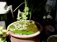 2002年8月31日の様子です。 極姫ガマは結局枯れてきてしまったので、代わりにコガマを買ってきて植えつけました。 アオミドロは完全には消えてないのですが、繁茂する様子はありません。 ムジナモは好調です。株数は30株になりました。 |