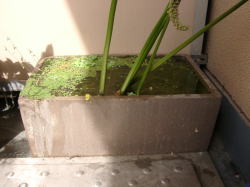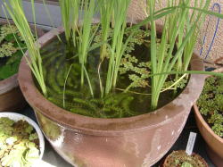 ●水鉢3号 水鉢3号、相変わらずほとんど変化はありません。タヌキモsp.はまだ花を咲かせ続けています。 ここでも少量ですがアオミドロの発生が見られました。ムジナモへの影響は今のところ見られません。 ここのムジナモは1号水鉢のものに比べてやや細めで華奢な感じです。 |