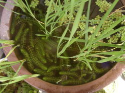 ●水鉢1号 何株か芽先が細くなってしまった物もありますが、概して1号水鉢のムジナモは好調です。ただここ数日、アオミドロがムジナモに絡みつくようになってしまいました。気温が低くなってきているのでそれほど旺盛に繁殖しているわけではないのですが、これから冬芽形成の時期になるだけに注意が必要です。 とりあえず毎日の潅水と手での除去をしています。 去年の記録を見てみると、あと1〜2週間で冬芽を形成し始めています。今年は今のところまだ形成は始まってはいないようですが、いずれにしろ好調なうちにしっかりとした冬芽を形成してもらいたい物です。 |