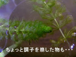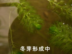●水鉢1号 ここに来て再びアオミドロが繁殖してきてしまいました。そのため水を全て入れ替えました。ムジナモに絡んだ物も出来るだけ手で取り除きました。アオミドロの影響か、芽が細くなってしまった物もあります。大事な時期だけに本当に悔しいです。 そんなムジナモですが、そろそろ冬芽を形成しつつあります。芽先が丸く固まり始めました。 |