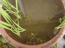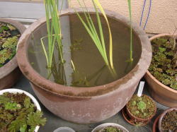 ●水鉢1号 ムジナモはすっかり冬芽になっています。まだ枯れた葉茎がついていますが、まもなく冬芽だけの状態になりそうです。 コガマもだいぶ枯れてきたので、数本を残して切り取ってしまいました。 この水鉢では未だに少量ですがアオミドロが発生しています。去年は冬季のアオミドロで冬芽をダメにしていますので、今回は十分に気をつけたいと思っています。この連休中にちょっと大掃除をしてアオミドロを根絶させたいと思っています。 |