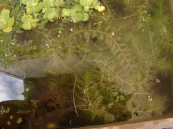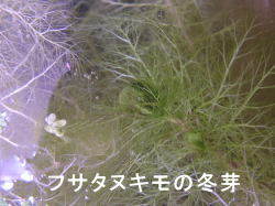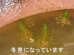 ●水鉢3号 ポンテデリアは地上部が枯れてしまいました。 こちらのムジナモも冬芽になっています。フサタヌキモもまだ茎が長く残っていますが、その先端には冬芽を形成しています。ノタヌキモ(?)は未だに花を咲かせています。 |