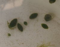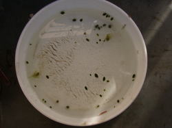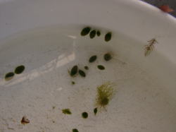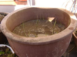 ●水鉢1号 冬だと言うのにアオミドロ(しかもとろろ昆布のように柔らかい・・・)が増えてきてしまいました。日当たりが良い場所にあるせいでしょうか。 そこで、まずミョウバンでアオミドロをやっつけておいて、一旦水を全て抜きました。 ムジナモの冬芽は太ったのもあれば、やせて小さいのもありますが、今年はあまり生育が良くなかったせいか小さいものが多いようです。 |
