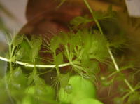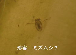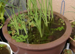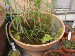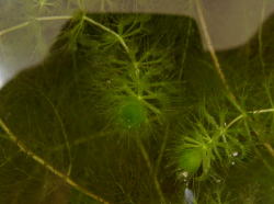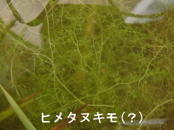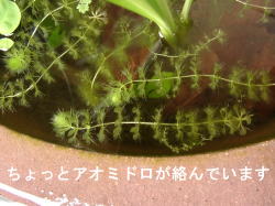 ●水鉢2号 この水鉢が今のところ一番アオミドロが酷いところです。ここにもピートモスのストッキング詰を投入しています。 ただ、ムジナモと一緒に入れてあるヒメタヌキモ(?)はそんな中でもぐんぐんと生長しています。 このヒメタヌキモも安西さんに送っていただいた物なのですが、その土の中に卵でもあったのでしょうか。ミズムシ(?)がたくさん発生してきました。思いがけない珍客です。 |