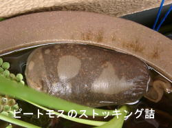 ●水鉢1号 再びアオミドロの発生が見られたので、ピートモスのストッキング詰を投入しました。 ムジナモも後ろ半分くらいにアオミドロが少量絡みついています。 ただ、そんな状況でも3つの水鉢のうち、この1号水鉢のムジナモが一番状態が良く、芽先も丸々と太っています。捕虫葉の大きさもダントツです。一体何が要因となっているのでしょう? |