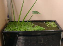 ムジナモは概ね順調に育っています。 アオミドロの発生も見られますが、今のところムジナモの生長に支障が出るほどではありません。 |