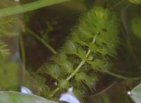●水鉢1号 以前ムジナモに絡んでいたアオミドロが少なくなくなりました。 ストッキングピートが功を奏したのか、ガマ&浮き草の生長で水中の栄養分が減ったのか、いずれにしろ喜ばしいことです。 ムジナモは良い状態で、分岐も始まりました。 なぜかこの水鉢のムジナモは節間が短く、コロコロしているのが多いようです。 |