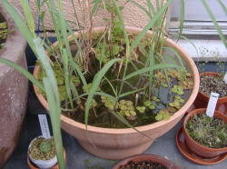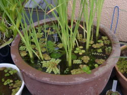 ●水鉢3号 ポンテデリア、ウトリspが花を咲かせました。 フィランタス・フルインタスがどんどん殖えています。オオフサモもすごい勢いで成長しています。 ここではまだアオミドロはまったく発生していません。 ムジナモも良い感じで成長しています。なぜかこの水鉢のムジナモが一番伸びる速度が速いようです。 水中はフサタヌキモがとぐろを巻くようになっています。 |