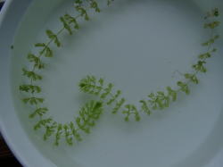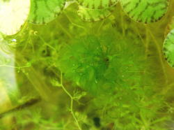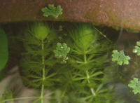 ●水鉢1号 コガマが良く育っており、水中にもふさふさとした根が出ています(おかげでヒメスイレンはぜんぜん大きくなってくれません)。 浮き草系も増殖しており、アオミドロはほとんど見当たらない状態です。 ムジナモは良く育っているのですが、何株かの芽先が下の写真のように貧弱になってしまっています。ただ、そうした株は脇芽が出てきていて、その脇芽はしっかりとしています。何が原因かはよくわからないのですが、とりあえず株全体が衰弱してきているのではないので一安心です。 |