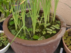 ●水鉢2号 アオミドロはまだ少量出ていますが、勢いはありません。ヒメタヌキモがぐんぐん勢力を広げています。 ここには2株ムジナモを入れてあるのですが、1株は良い状態なのに、もう1株はちょっと貧弱になってしまいました。 |