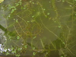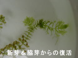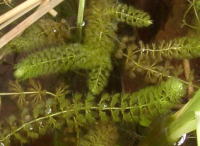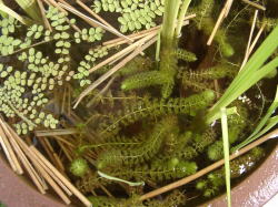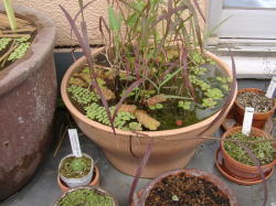 ●水鉢3号 新設してからなかなか水の濁りが取れなかった水鉢3号ですがやっと透明になってきました。 仮住まいが長かったせいか、濁りが取れていないうちに戻したせいか、ここのムジナモはみんな芽先が捕虫葉がつかないような貧弱なものになってしまいました。幸い最近徐々に元気を取り戻しつつあります。下の写真のように、脇芽から復活する物もあれば、新芽から復活する物もあります。 フサタヌキモとタヌキモsp.(おそらくノタヌキモ)は元気に生長しています。やはりムジナモはタヌキモ系より数段繊細なようです。 |