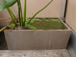 ●水鉢1号 コガマが茂りすぎて水中の根をたくさん漂わせています。それのせいでしょうか。ちょっと前からこの水鉢のムジナモのうち何株かがホウ素欠乏症の症状を見せていました。とりあえずホウ酸の投入、ピートの交換、稲ワラの追加投入と考えられる対策をすべて講じてみました。 その甲斐あってか、新しく健康な芽が伸びつつあります。しかしまだ本調子ではなく、いまだホウ素欠乏の症状が出る株があります。なかなかうまくいかないものです。 また、アオミドロも再発生してきています。梅雨が明けて気温が上がった時がちょっと心配です。 |