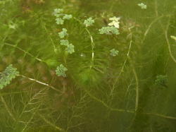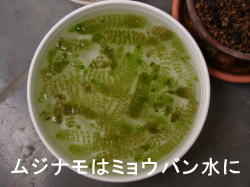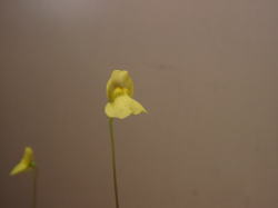 ●水鉢3号 やっと水の濁りが取れ、底まで見えるようになりました。フサタヌキモが繁茂する中で、ムジナモも割りと好調に育っています。ただ、ほとんど分岐をしてくれないので、数は増えません。 タヌキモsp.は毎日のように花を咲かせています。 |