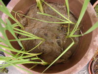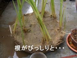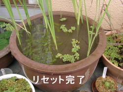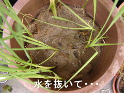 やっとちょっとは夏らしい気温になりましたね。 ムジナモは好不調を繰り返しており、どうもうまくいきません。 それに加えて水鉢1号はアオミドロの繁殖が復活してしまいました。そのようなわけで思い切って水鉢1号をリセットすることにしました。 左の写真は水を抜いた水鉢1号です。コガマの根が表土一面にびっしりと張っています。 |