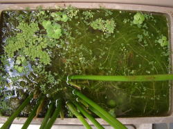 ●水鉢1号 水鉢1号のムジナモは調子が良いと思ったら不調になったり、また持ち直して調子よくなったりを繰り返し、どうも思うように育ってくれません。加えて、気温が高くなり再びアオミドロが繁殖してきてしまったので、思い切ってリセットすることにしました。 数日前にミョウバンを加えてアオミドロを除去。ムジナモは別容器にとってミョウバンを入れ、さらに念入りにアオミドロを取り除きました。 水を抜いてみるとコガマの根が底土の表面いっぱいにびっしりと張っています。 今回は底にまずピートモスを1センチ程度敷き詰めて、その上にADAのビオソイルを使ってコガマを植え込みました。 さて、これで調子を取り戻してくれればいいのですが・・・。 |